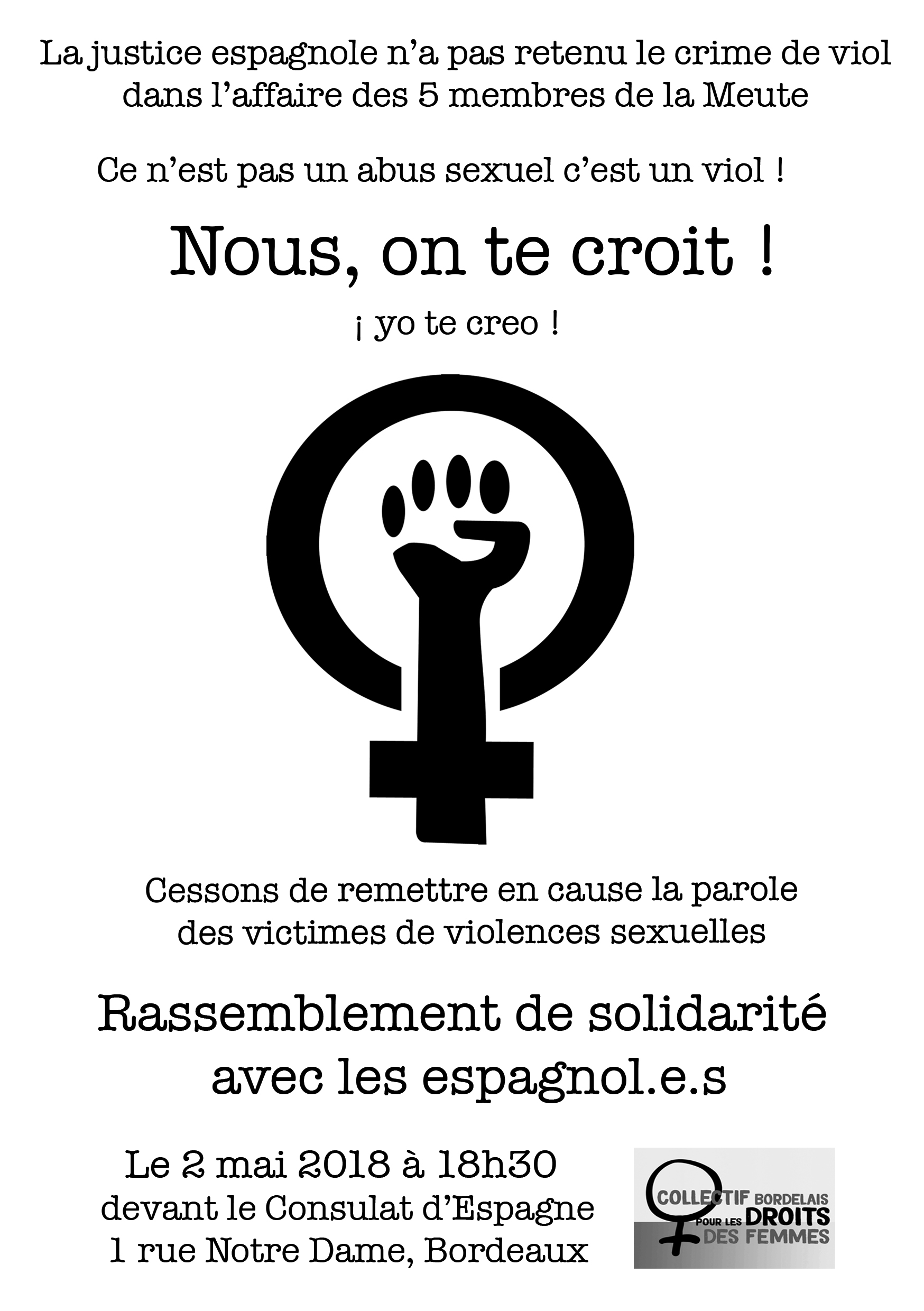 NOUS, ON TE CROIT ! Suite aux verdict du procès de la « meute » , affaire du viol de pampelune, reclassé en « abus sexuel », les espagnol.e.s indigé.e.s, occupent massivement la rue. Le collectif national des droits des femmes a participé ce dimanche 29 avril à Paris à une manifestation de soutien aux côtés de la communauté espagnole.