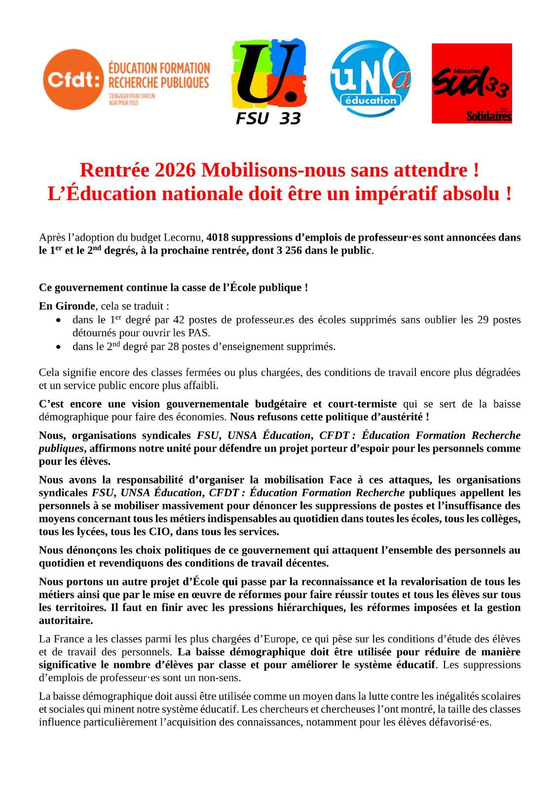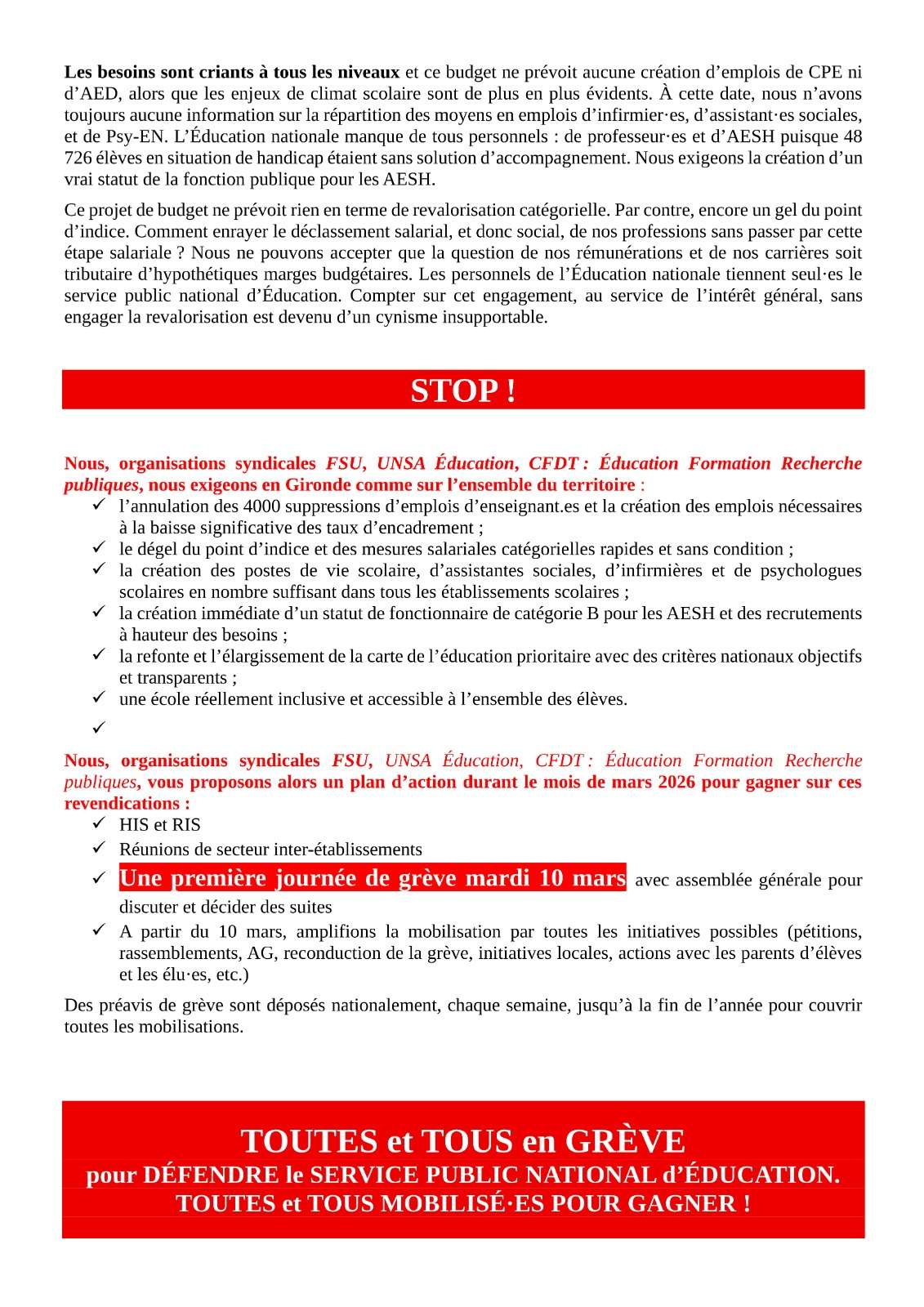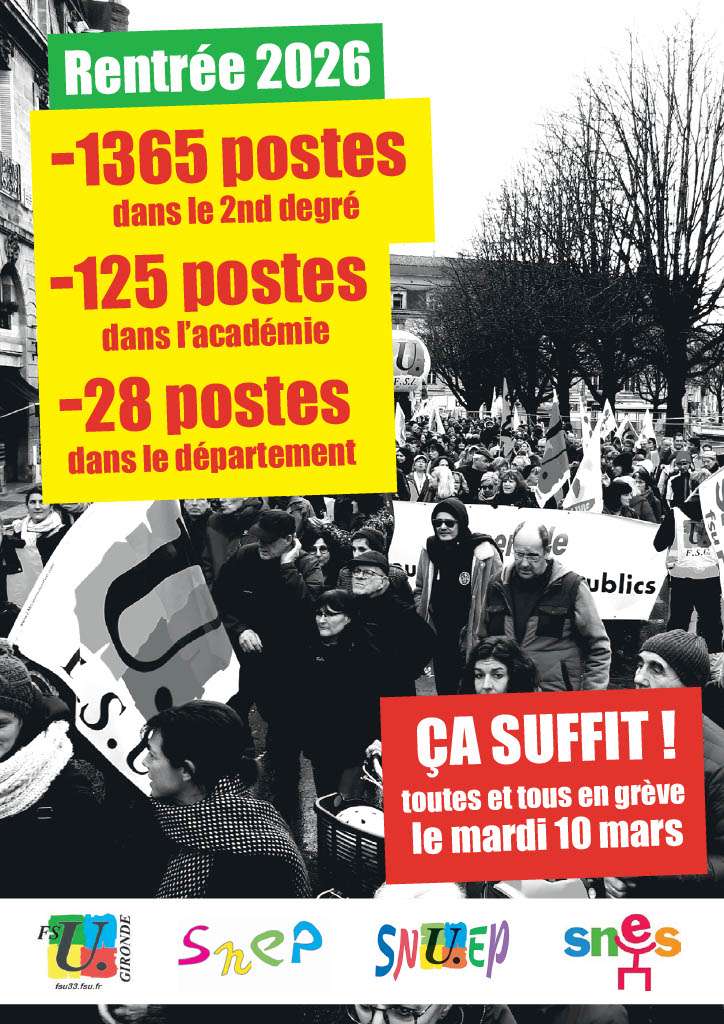 Rentrée 2026 dans l’éducation : Toutes et tous en grève le mardi 10 mars en Gironde ! 2026-03-03T18:19:57+01:003 mars 2026|Catégories : À LA UNE| Partagez cet article ! FacebookXWhatsAppTelegramEmail Articles similaires Communiqué intersyndicale Iran Communiqué intersyndicale Iran 24 février 2026 Campagne française flottille de la liberté pour Gaza Campagne française flottille de la liberté pour Gaza 24 février 2026 8 mars Journée internationale de lutte pour le droit des femmes 8 mars Journée internationale de lutte pour le droit des femmes 24 février 2026 Communiqué – La FSU condamne les violences et appelle à cesser l’instrumentalisation et les pressions Communiqué – La FSU condamne les violences et appelle à cesser l’instrumentalisation et les pressions 19 février 2026 Communiqué intersyndical Ukraine il est urgent de stopper la guerre ! Communiqué intersyndical Ukraine il est urgent de stopper la guerre ! 19 février 2026